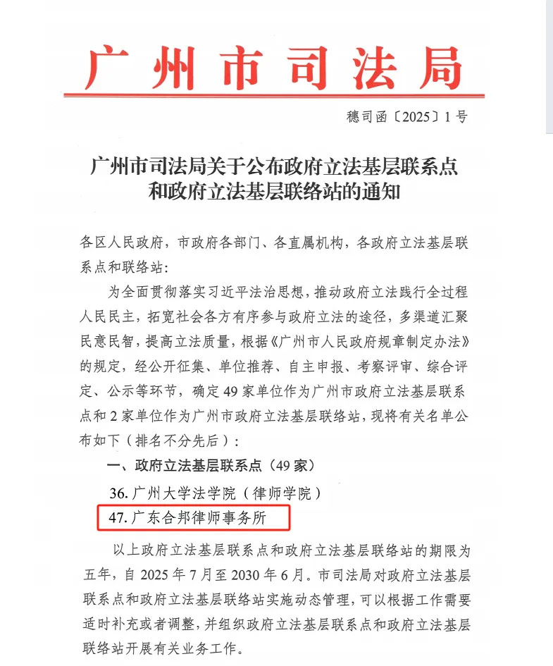近日,广州市司法局发布《关于公布政府立法基层联系点和政府立法基层联络站的通知》,广东合邦律师事务所凭借深厚的专业积淀和强烈的社会责任感,积极申报,经过广州市司法局的严格考核,最终成功入选广州市政府立法基层联系点,期限为五年。此次入选,是对合邦所以往积极服务地方法治建设的肯定,也为合邦所搭建起一个服务地方法治建设的专业平台,让合邦所今后能更好地发挥专业优势,深度参与地方法治建设。